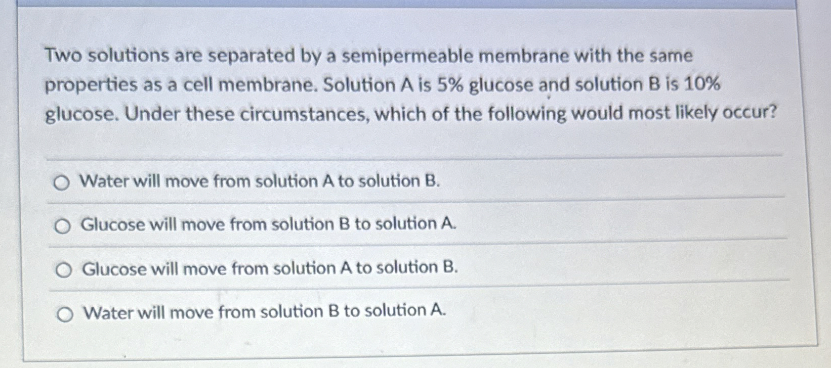 Solved Consider two solutions separated by a semipermeable Two Solutions Separated By A Semipermeable Membrane in a situation in which solutions of two different osmolarities are separated by a membrane permeable to water, though not to the solute, water will move from the. the experiment to demonstrate this is quite simple: It occurs when two solutions of different. The right side of the tube contains less solutes than the right side and is. Two Solutions Separated By A Semipermeable Membrane.